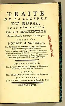 Nicolas-Joseph Thiéry de Menonville (Saint-Mihiel, France, 18 June 1739 – Port-au-Prince, Saint-Domingue, 1780), avocat at the Parlement of Paris,[1] was a French botanist who volunteered to be sent to Mexico in 1776 to steal the cochineal insect valued for its scarlet dye. In his clandestine biopiracy, he worked without official papers and would have been ruthlessly treated had he been caught. He succeeded in naturalizing the insect and the prickly pear (Opuntia) "nopal" cactus on which it depended in the French colony of Saint-Domingue.[2]