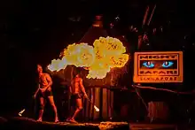 The "Creatures of the Night Show" is a performance presented by the animals in the Night Safari. A binturong shows off its ability to hang upside down with its prehensile tail, a spotted hyena displays its powerful jaws and otters spread awareness to recycle reusable items.[8]