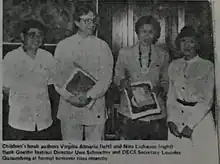 - ↑ Moonaesthetic (2023-11-19), English: Children's book authors Virgilio Almario (left) and Nita Hontiveros-Lichauco (right) flank Goethe-Institut Director Uwe Schmelter and DECS Secretary Lourdes Quisumbing, retrieved 2023-11-19