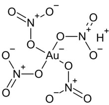 Nitratoauric acid, hydrogen tetranitratoaurate, or simply called gold(III) nitrate is a crystalline gold compound that forms the trihydrate, HAu(NO3)4·3H2O or more correctly H5O2Au(NO3)4·H2O.[3][2] This compound is an intermediate in the process of extracting gold.[4] In older literature it is also known as aurinitric acid.[5]