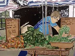 Westside Views, Nitza Tufiño, 1989. In collaboration with Elizabeth Montalvo (produce stand) and Leeama Blugh (shaved-ice cart) 86th St. station (at Broadway), New York City
