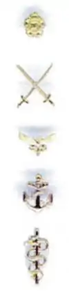 Award of the decoration for service in active military operations is indicated by distinguishing insignia which indicate the arm of the service in which the recipient was serving at the time of the action for which the decoration was conferred. These insignia are struck in 9 carat gold and are worn on the ribbon, above any bars which may have been awarded.[2]