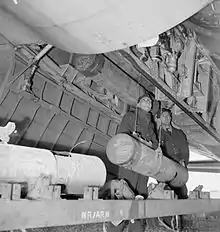 Loading 250 lb depth charges into a 220 Squadron Fortress IIA at RAF Benbecula