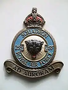 There is no known record of the squadron having either a badge or a motto during the First World War. In 1943, a badge was approved which consisted of a "Panther's face" along with the motto Ad Auroram, (Latin: To the break of dawn).