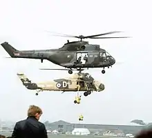 The squadron reformed on 14 June 1971 at RAF Odiham as the RAF's first Westland Puma squadron[12] it took part in the Gulf War of 1991, the Kosovo War in the late 1990s, relief operations during the flooding in Mozambique in 2000 and NATO operations in Bosnia in the early 2000s.[13] On 13 June 1997, the squadron moved from Odiham to Benson.[14]