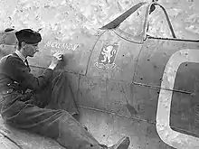 On 22 August the squadron suffered its worst day; during a high cover escort mission for B-26 Marauders, over 50 German fighters attacked the Biggin Hill Wing. Four of the squadron's pilots were shot down with two enemy aircraft shot down in return. One of the pilots lost was Jack Rae, who had destroyed at least eleven enemy aircraft by that stage of the war; he became a prisoner of war.[58] Checketts was shot down the next month but despite receiving burns to his hands and face, he was able to link up with the French Resistance.[59] With their help he, and another pilot of the squadron who had also been shot down and avoided capture, was able to return to England via a fishing boat in October.[60][61]