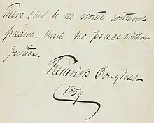 1859 autograph note by Frederick Douglass: "There can be no virtue without freedom, and no peace without justice"