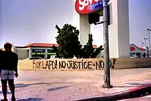 The 1992 Los Angeles riots are remembered for the use of the slogan,[7] which expressed collective frustration with the existing political order.[8]