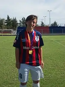 Espíndola during her time at San Lorenzo, wearing the gold medal she won with the Argentina national team at the 2014 South American Games.