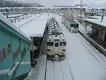 Noheji Station (野辺地駅, Noheji-eki) is a railway station located in the central district of the town of Noheji in Aomori Prefecture, Japan. The station has been operating since 1891. Since 2010, the station has been jointly operated by the East Japan Railway Company (JR East) and the Aoimori Railway Company, a third sector, regional rail operator. The station is the southern terminus of JR East's Ōminato Line and was formerly the northern terminus of the Nanbu Jūkan Railway.
