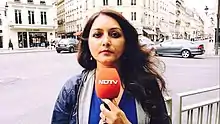 As Europe correspondent and Resident Editor with NDTV, Tiwari reported major events and stories from all over the continent since 2004. She reported extensively on tax evasion and money laundering with exclusive interviews of major whistleblowers in the world of finance.[15][16][17] She also contributed episodes on Sikhs in France, Indian Soldiers in WW1 for NDTV's India Matters.Her breaking news report on the French aircraft carrier Clemenceau (2004) was followed by an extensive coverage of the story in Indian media and the aircraft carrier had to eventually return after India's Supreme court ruling.[18] In her interviews with LTTE cadre (2006), Anton Balasingham expressed regret for Rajiv Gandhi's killing which was the closest the militant outfit came to admitting their responsibility for the murder.[19][20] Tiwari has covered several major elections in Europe and Indo-French bilateral visits.[21][22] Tiwari also reported on the COP21 Paris summit,[23] the Greek referendum,[24] Papal Conclaves,[25] Indo-French civil nuclear deal,[26] Italy-India diplomatic row over marines,[27] India and Pakistan at the International court of justice, the Mittal Arcelor take over.[28] She won the ENBA 2016 award, Best International coverage for the Paris terror attacks.[29][30]