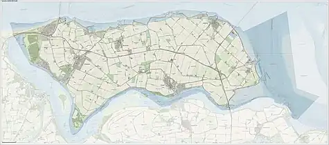 Noord-Beveland (Dutch pronunciation: [ˈnoːrd ˌbeːvəlɑnt] ; "North Beveland") is a municipality and region in the southwestern Netherlands and a former island, now part of the Walcheren-Zuid-Beveland-Noord-Beveland peninsula. Noord-Beveland is enclosed by the Oosterschelde estuary to the north, and the former straits, now combined lake, of Veerse Meer and Zandkreek to the south. As part of the Delta Works, dams have connected Noord-Beveland to Walcheren and Zuid-Beveland.