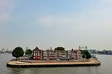 In 1883 the Russian Achilles M. De Khotinsky built the first light bulb and accumulator factory in the Netherlands at Prins Hendrikkade 35.[1] The oldest Rhine shipping company for bulk goods W. van Driel Stoomboot- & Transportbedrijven was founded in 1888 by Willem van Driel sr. (1845-1911), with headquarters on the Noordereiland in Rotterdam on the Maaskade[2] to operate a tugboat company and to focus on mass transport to the Rhine of grain, ore, etc. The Hulstkamp building from 1892 is a national heritage monument on the Maaskade. At the beginning of the Burgemeester Hoffmanplein is the Wilhelmina fountain designed by Henri Evers in 1898 on the occasion of the accession of Queen Wilhelmina to the throne. In 1907, the municipality of Rotterdam opened a floating wooden bathing and swimming facility on the Maaskade, which was closed in 1962 due to polluted river water and because there was no money left for maintenance. With the arrival of the container and the relocation of port activities to Botlek, Europoort and Maasvlakte, the Noordereiland has become more residential.