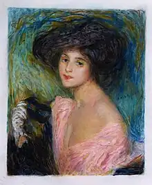 Nori Malo-Renault produced etchings in color,[3] sometime adding drypoint and aquatinte, for example for the print of La Femme au masque after a pastel by Edmond Aman-Jean whose five plates of copper (one by color) are kept in Paris at the Chalcographie du Louvre.