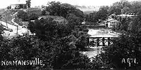 Normansville was originally called Upper Hollow; it was named for the deep ravine carved by the Normans Kill in which it was located. Further downstream was Lower Hollow, later named Kenwood. Upper Hollow had its start in 1805 with the construction of the Delaware Turnpike, which ran from the City of Albany to Otego (which then was part of Delaware County).[1] The Turnpike was carried over the Normans Kill ("kill" is the middle Dutch word for "stream") by a 100-foot-long (30 m) wooden bridge. Northwest of this bridge was a toll gate. The wood bridge was washed away by a freshet in 1869[2] (one year after the turnpike company had abandoned the Turnpike) and the Town of Bethlehem built an iron bridge in its place.[1][2]