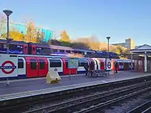 The railway station at North Acton. The visible lines are platforms 1, 2, and 3 (one with a train) of the Central line. Beyond is a High Speed Train passing through the Network Rail (national railway) line.