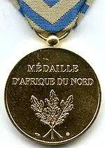 The North Africa medal was a 34mm in diameter gilded medal struck from bronze. The obverse bore the relief image of an Agadez cross (Southern cross) surrounded by the inscription also in relief "RÉPUBLIQUE FRANÇAISE" (English: "FRENCH REPUBLIC"). The reverse bore the relief inscription on two lines "MÉDAILLE" "D'AFRIQUE DU NORD" (English: "MEDAL" "OF NORTH AFRICA") over the relief image of a sprig of three oak leaves.[1]
