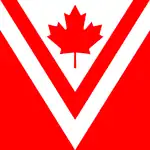 The "V" represents vexillology. The colors are from the flags of the two original countries in the association, Canada and the United States.