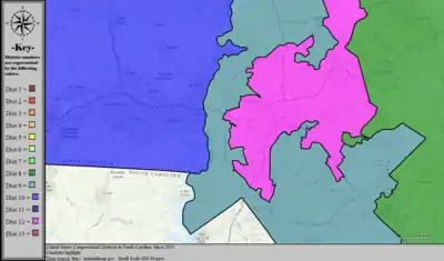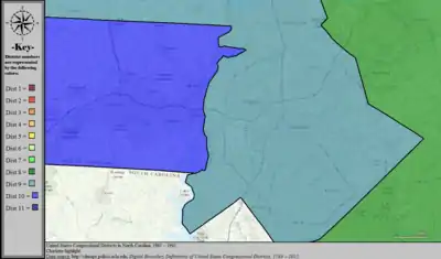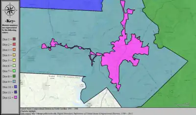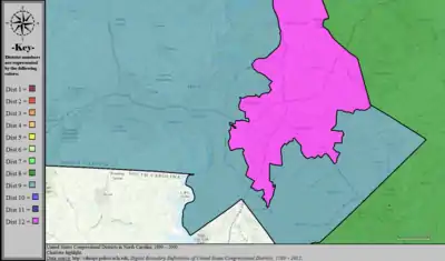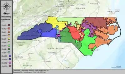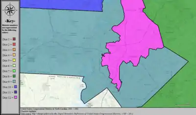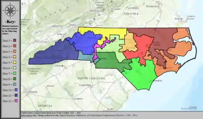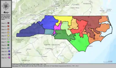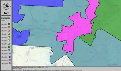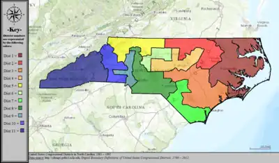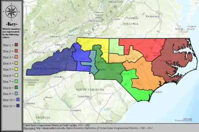 Table of United States congressional district boundary maps in the State of North Carolina, presented chronologically.[33] All redistricting events that took place in North Carolina between 1973 and 2013 are shown, congressional composition is listed on the right.