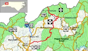 North Carolina Highway 197 (NC 197) is a South-to-North state highway in Western North Carolina. The route is approximately 58 miles (93 km) in length and with its continuation into Tennessee as SR 395 connects Erwin, Tennessee to Flat Creek, North Carolina.[3] Portions of this highway lie within the Pisgah National Forest and is one of the few highways in the state with an unpaved portion.