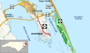 Around 1950, US 64/US 264 was routed onto Roanoke Island (ferry from Manns Harbor and bridge to Nags Head) with both sharing concurrency with NC 345 through Manteo.[5] In 1965, NC 345 was reduced by .33 miles (0.53 km) at the Fort Raleigh National Historic Site.[6] In 1967, US 64/US 264 replaced NC 345 through Manteo, pushing its northern terminus to its current location.[7] Also same year, NC 345 was rerouted in Wanchese, from going west to the Croatan Sound to east along the Mill Landing Creek area (originally NC 345A), ending at Thicket Lump Drive (SR 1141); its old alignment became Old Wharf Road (SR 1168).[8][9]