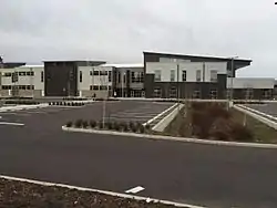 Completed in 2016, North Creek High School was designed by Dykeman Architecture.[16] NCHS began its first academic year fall of 2017.[17] The campus covers 61-acres, with a 250,000-square-foot facility.[18] The school was built with three, two story buildings that included and facilitated STEM classrooms and flexible learning areas.[19] As well, the buildings held a common area, gymnasium, cafeteria, and a performing arts center. Other features of the school include athletic fields, parking, and landscaping as well as wet lands and rain gardens. Construction also featured a wall-to-wall tension grid system and a versatile retractable seating system.[20] The projects main goal was to create a facility with a "deep green" design in order to foster a sustainable school.[21][22] The large project required a heavy amount of logging and earthwork activities. With this sustainability goal in mind the school was built using sustainably sourced materials and kept in mind water and energy conservation. Other aspects of the sustainable project included an energy saving geothermal heat recovery system, a site harvested wood program, and 100kW photo-voltaic array.[23] Additionally, all the trees that were cut down during construction were integrated into the design and construction of the school.[24] Generally speaking, NCHS found many ways to help minimize their carbon footprint.[25] The main buildings have wide hallways with tables, couches, and collaboration cubes.[26] Classrooms have sliding glass walls, that are bullet resistant.[27] NCHS's unique architecture was designed to increase collaboration and group work amongst students - making several spaces on campus suitable for learning.[28]