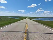 Highway 50 through the Lostwood National Wildlife Refuge with Lostwood Lake on the right.