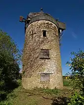 In the centre of the village is North Leigh windmill. It is a tower mill built in 1833 by Joseph Shepherd, who was a baker as well as a miller.[15] It had four common sails and a conical cap.[16] The mill was restored in 1881 and 1933, but during the Second World War the cap was removed in 1940 to make an observation post.[15] This led the interior of the building to fall into decay, and in the 1980s West Oxfordshire District Council tried to compel the owner to repair it.[15] The mill still lacks sails, but it now has a new cap to make it weatherproof.