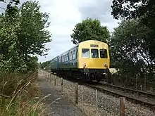 Starting from Sheringham station, the lines follows the coast westwards, soon passing over the Automatic Open Crossing at Sweetbriar Lane, where the private road leading to Sheringham Golf Club crosses the line.[36] The line climbs a 1 in 97 gradient, with the golf course, and Skelding Hill,[37] on the seaward side of trains, while the A149 can be seen on the landward side of trains, roughly paralleling the tracks with Upper Sheringham visible in the distance. During WW2, Skelding Hill was the location for an emergency coastal battery, complete with an underground headquarters bunker.[38]