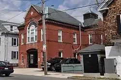 The North Street Fire Station is a historic fire station at 142 North Street on the north side of Salem, Massachusetts, and one of the oldest active service fire stations in the United States. The brick Queen Anne structure was built in 1881 to a design by local architect William Dennis, and is the oldest active fire station in the city. It was the second brick fire station built by the city, its design similar to the first one, built for ward 5 in 1880 and destroyed in the Great Salem Fire of 1914. The building as designed had a single bay to house a steamer, with space for stabling horses in the rear. The upper level included a wardroom, which made the station a center for social and civic functions, such as political meetings and elections.[2]