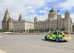![]() A rapid response vehicle (RRV) going past the Three Graces of Liverpool | |