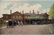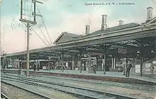 The main station building, a two-storey structure in the Italianate style, was located on the up side and consisted of a central block with two cross-wings.[29] The wings had gable roofs, whereas the central part had a low-pitched hipped roof.[29] Two standard L&NWR signal cabins were positioned to the north and south of the platforms, these being known respectively as Northampton No. 1 and No. 2 boxes.[29] Other signal cabins, Northampton No. 3 and No. 4, were sited further north and controlled extensive marshalling yards.[29] A fifth cabin at Duston West Junction lay to the south-west; it controlled the apex of the Northampton triangle.[29] No. 2 was the largest signal cabin with 118 levers which controlled the country end of the station, access to the goods shed and the south end of the goods yard.[30]