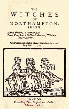 The second source comes from a pamphlet of 1612 titled The Witches of Northamptonshire (London, 1612)[3] also an unknown author reproduced here.[4] Who details the immoral lives of the witches and the godliness of their victims and misses out a few facts of the Belcher/Avery story and recants gossip rather than having a personal acquaintance with the trial. The pamphlet focuses on Agnes Browne and her daughter Joan Browne(or Vaughan), Arthur Bill, Helen Jenkenson and Mary Barber. Bill, Jenkenson and Barber were unconnected to the murder case of Belcher/Avery and came from a different part of Northamptonshire.