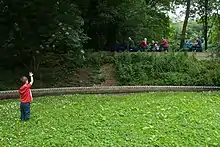 Bradford Model Engineering Society operate two railway tracks in the woodland area of the park. The gauges vary between 3.25 inches (83 mm) and 5 inches (130 mm) on a raised oval track that runs for 440 feet (130 m) and a larger loop that runs on the ground for 2,000 feet (610 m) and takes trains of 5-inch (130 mm) and 7.25-inch (184 mm) gauges.[21] The society is one of the oldest model engineering societies in Britain (founded in 1908) and operates the railways in summer for passengers weather permitting.[22] The society refer to, and label their railway, as Northcliff Railway using one of the older spellings of the name.[21]