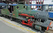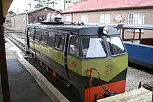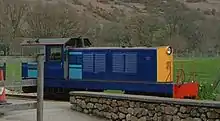 In December 1929, a 4 ft 8+12 in (1,435 mm) standard gauge 0-6-0 diesel locomotive was obtained to work the Ravenglass-Murthwaite section. It was built by Kerr Stuart (works number 4421) and had a six-cylinder, 90 horsepower (67 kW), McLaren-Benz engine. Transmission was mechanical and final drive was by roller chains. In 1955 it was sold, through a dealer, to the National Coal Board for use at Wingate Grange Colliery, Durham. A new Dorman engine of 90 horsepower (67 kW) was fitted in 1960.[9] It is now preserved at the Foxfield Light Railway,[10] restored to original external condition, and was displayed at Ravenglass in the summer of 2000.