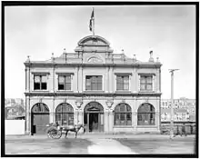 Charles Ranson commissioned Arthur P. Wilson to design the £6000 (or £5000)[39] building opposite the wharf used by their steamers, on newly reclaimed land, leased from Auckland Harbour Board (AHB). In 1899 NSS moved from Palmerston Buildings on Queen St to their new 2-storey brick building with dark green joinery, a public office, manager's office, space for other staff, telephone room and a boardroom. It had high ceilings and on each level the floor above was supported by cast iron columns. On Quay St a central door, gave access to the main office and floor above, and an eastern door accessed the wharves (now Marsden Wharf)[40] and warehouse to the rear of the building. A boardwalk allowed passengers to cross to the steamers without walking through mud. A third floor was added in 1921 to provide accommodation and a laundry. In the 1940s many of the original features were lost. Originally the building stood alone. The land on the other side the building was their yard until the 1950s when AHB roofed it over as a garage in an attempt to compete with trucking firms. When NSS ceased trading, the building reverted to AHB.[41] In July 1988 the Historic Places Trust listed it as "Category 1".[42] It is now a bar.[43]