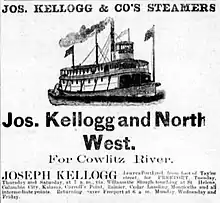 - 1 2 "Jos. Kellogg & Co's Steamers Joseph Kellogg and Northwest for Cowlitz River". The Oregon Mist (advertisement). Vol. 8, no. 37. St. Helens, OR: J.R. Beegle. September 11, 1891. p.4, col.6.