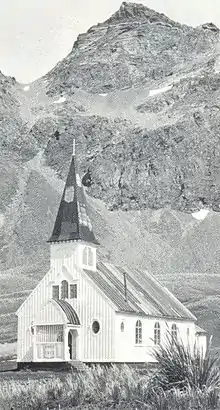 The church, one of the world's southernmost churches, was consecrated on Christmas Day in 1913. In 1922, a funeral service for Sir Ernest Shackleton was conducted in the church before his burial amongst 64 others in the church cemetery.[3] The cemetery, located approximately 700 metres (2,300 ft) to the south on the other end of Grytviken Harbour, also holds empty graves for whalers lost at sea.[4]