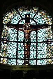 The original stained glass disappeared with the first church during the Revolution. The present stained glass is from the mid-20th century.