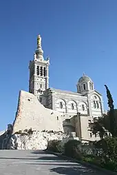 Notre-Dame de la Garde (literally: Our Lady of the Guard), known to local citizens as la Bonne Mère (French for 'the Good Mother'), is a Catholic basilica in Marseille, France, and the city's best-known symbol. The site of a popular Assumption Day pilgrimage, it is the most visited site in Marseille.[1] It was built on the foundations of an ancient fort at the highest natural point in Marseille, a 149 m (489 ft) limestone outcropping on the south side of the Old Port of Marseille.