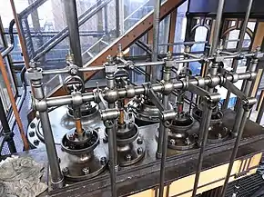 The Steam Gallery[12] contains a Basford Beam Engine, one of a pair of engines built in 1858 by R. W. Hawthorn in Newcastle upon Tyne. It was installed at Basford Pumping Station to lift water 110 ft from the sandstone below to supply fresh water to the City of Nottingham. The engine was replaced in 1965 and was removed to the purpose-built Steam Gallery where it was first fired in 1975. Also in this building today are a variety of pumps and engines, many of which were removed from local companies; for example E. Reader & Sons of Phoenix Engine Works, Cremorne Street, Nottingham (Makers of high-speed stationary steam engines).[13] At the bottom end of the gallery stand two ploughing engines. These have consecutive registration numbers and were the last two production engines to come out of Fowlers Leeds Foundry. Owned by Nottingham City Council, they were used for ploughing the treated sewage into the land at a large dairy farm at Stoke Bardolph. One of these engines is operational and is used at the steam up events. Next to the ploughing engines is a J. T. Marshall Portable steam engine, built at the Nottingham Engineering Works, Sandiacre, in 1886. It has been restored to full working order and can be seen operating at the steam up events.
