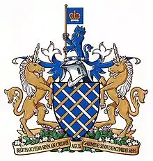 Two unicorns Or armed crined and unguled Argent standing on a compartment of mayflowers and thistle flowers Proper.