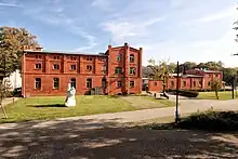 On September 1, 1939, the day Germany invaded Poland, causing World War II, the Germans murdered the local Polish customs inspector.[2] The town was then annexed by Nazi Germany. During the war, a subcamp of the Stutthof concentration camp was operated by the Germans in the town.[3] One of the places where the Germans used the forced labour of Stutthof prisoners was the train station, where there is now a memorial plaque. After the defeat of Nazi Germany in the war in 1945, the town again became part of Poland.