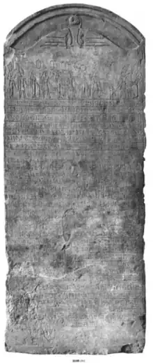 The limestone stele is rounded at the top, is 4 feet 2 inches (1.27 m) high, and 1 foot 8 inches (0.51 m) wide.'[1] The Nubayrah Stele is named for the present day town of Noubarya-(?) on the former Canopic branch of the Nile River; the town is southwest of Damanhur. The original "Nubayrah" was close to Damanhur.[2]