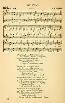 "O'er the Gloomy Hills of Darkness", also titled "O'er Those Gloomy Hills of Darkness",[1] is a Welsh Christian hymn by William Williams Pantycelyn written in 1772.[2] The hymn was written as a missionary hymn; there are conflicting accounts of why the hymn was written. The hymn was later published in 374 hymnals worldwide,[3] though it was censored and altered in the United States by slaveholders for evangelising to slaves. The hymn later fell out of favour with hymn book editors in the 1960s.