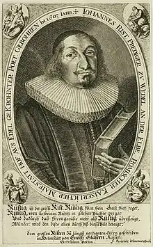 Rist wrote "O Ewigkeit, du Donnerwort" as a poem in 16 stanzas.[1][2] He published it first in his collection Himlische Lieder (Heavenly songs) in Lüneburg in 1642, p. 51, in 16 stanzas of 8 lines, entitled "An earnest contemplation of the unending Eternity." It was printed in Burg's Gesang-Buch in Breslau in 1746 in full length. Later editions often shortened the song. The melody was written by Johann Schop for "Wach auf, mein Geist, erhebe dich". It was adapted by Johann Crüger for "O Ewigkeit, du Donnerwort" when he published it in the 1653 edition of his hymnal Praxis.[1]
