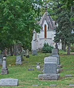 The cemetery office, a single story, front-gable structure of rock-face fieldstone, is located on the south side of University. Nearby is the Buckland Memorial Chapel, dating from 1898. The chapel is a sandstone structure built in an old English style. A number of mausoleums also dot the grounds.[2]