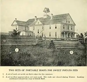 On 8 November 1908, the boy's dormitory was lost to fire and a temporary replacement was built by the students in 1909. In 1910, construction began on the permanent replacement building. The students and superintendent built the first steel reinforced concrete foundation in the territory, using sand from a nearby creek, rocks and bricks from previously burned buildings and iron from the "scrap pile".[31] On 13 March 1910, the girl's dormitory also burned and the students were forced to relocate to the original log house, which had been the first home of the boarding school. A donation of $5,000 was made by David Elliott[32] a prominent farmer from Lafayette, Indiana[33] for the replacement of the school buildings in the name of his deceased wife Alice Lee Elliott. Upon completion of Elliott Hall, the school was renamed the Alice Lee Elliott Memorial Academy, commonly called Elliott Academy, and was dedicated on 13 June 1912.[32] That same year, the first black administrator of the institution, William H. Carroll, was appointed superintendent.[34]