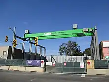 An overhead crane was assembled on the pile wall at the site of the station's main entrance. According to Metrolinx, this is the first time in Canada an overhead crane has been used over an open excavation. The site had no space to install a more typical tower crane or a luffing crane. The crane stands 12 metres (39 ft) tall and, when combined with its beams, weighs 73 tonnes (80 tons). It went into operation in mid-September 2017.[14]