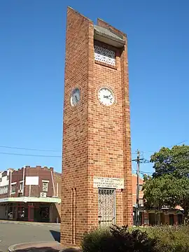 Judd's Hurstville Brickworks was located on the northern side of Hurstville Road; its 13-hectare site straddled the northern boundary of Oatley with neighbouring Mortdale. It was established by William George Judd (1847—1929).[74] It operated from 1884 to 1972, making bricks using shale from a quarry that occupied much of the Oatley end of the site. Two tall brick chimneys were demolished in June 1973, along with the brick-making plant and kilns,[75] and the company went into voluntary liquidation.[76] The brickworks once had its own railway siding.[77] Fifteen brick cottages were built along the western side of Judd Street, just across the boundary between Mortdale and Oatley, to rent to workers at the brickworks; some still survive.